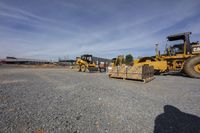 An empty lot in Johnson City, Tennessee, filled with construction vehicles. The rugged terrain contrasts with the parked bulldozers. Open space and clear sky highlight the ongoing construction in this Tennessee city.