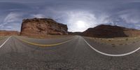 an upside down view of an empty mountain road with mountains in the background, from a fish - eye view mirror
