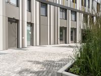 A large planter sits outside an empty office building in Berlin's business district. The modern architecture and metal walls create a sleek and professional look. The cobblestone surface adds a touch of charm to the surroundings. It is a bright sunny day, highlighting the beauty of the building's design and the well-maintained brick ground next to it.