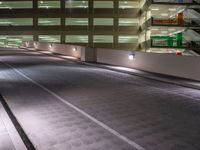 This stock photo features an empty parking garage in Los Angeles, USA. The long, asphalt floor is illuminated by the lights at the end of each lane. The artificial light creates a moody atmosphere in the dark night. The image captures the entrance and driveway of the parking deck, providing a glimpse into the suburban residential area. Street lights in the distance add to the overall ambiance.