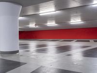 This stock photo features an empty parking garage with a red wall and white columns. The spacious parking garage floor is clean and well-maintained. The large white columns create a strong architectural presence. The black and white color palette adds to the modern aesthetic of the space. With ample artificial light and a high ceiling, this parking garage provides a safe and secure parking option. The concrete surface and durable flooring are designed for heavy vehicle traffic. Located in Berlin, Germany, this parking garage is a convenient option for those in the area.