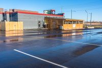 This stock photo features an empty parking lot located next to a shopping center on a street corner in Toronto, Ontario, Canada. The parking lot is made of asphalt and is surrounded by a clear sky. It's a bright day in Toronto, making it a perfect time to eat out at the nearby restaurant.
