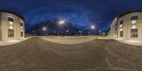 the picture shows a very empty parking lot on a cloudy night with no one at all
