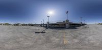 a fish - eye lens photo of a empty parking lot, the sun is shining down on it