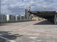 an empty parking lot with buildings and a road near by it on a partly cloudy day