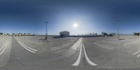 An empty parking lot in Los Angeles with a fish-eye lens view of the city skyline. Modern architecture and high-rise buildings dominate the landscape, contrasting with the clear sky. A glimpse into the bustling metropolis of Los Angeles.