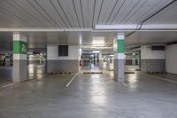 large empty parking spaces in an empty and empty mall garage area with green and white pillars
