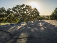 This stunning stock photo captures an empty parking lot located in California, USA, where trees are growing out from the asphalt. The parking lot is situated near a beautiful tree-filled hill with rock formations, creating a picturesque landscape. The image showcases the tranquility and open space of the area, with the sun shining brightly and casting shadows. The clear sky and sunlight add to the natural beauty, making it a perfect destination for recreational activities. Start your day early and arrive at this sunny spot to enjoy the break of day in this remarkable recreational area.