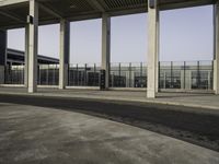 This stock photo features an empty parking lot with an open building in the backdrop. The neatly paved concrete and asphalt road surface leading up to the building adds to the urban atmosphere. The building facade showcases a modern office building with symmetrical columns and shades. The metropolitan area setting creates a sense of hustle and bustle. The gray tints and shades of the building and surroundings give a contemporary feel. This photo can be used to represent public space, architecture, or urban environment.