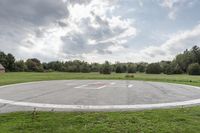 a empty parking lot with no one on the grass outside, a large circular basketball court in the middle of a green field