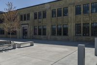 This stock photo shows an empty parking lot in Toronto, Canada. The parking lot is located outside of a modern brick building. There are benches and trees on the parking lot, as well as trees surrounding the area. The photo was taken during the day, capturing the vibrant colors of the vegetation and the clear sky. The building's facade is made of composite material, with windows and doors adding to its modern architecture. The parking lot is part of a residential area, showcasing the infrastructure and road surface. This image is perfect for representing property, real estate, and urban design concepts.