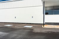 A photo of an empty parking space in Toronto, Ontario, Canada. The asphalt road leads to a parking lot next to a storefront. The clear sky and trees in the background create a peaceful urban ambience. Perfect for illustrating the urban lifestyle, shopping, and day-to-day activities in Toronto.