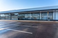 This stock photo features empty parking spaces for cars outside an open building in Toronto, Ontario, Canada. The building has windows and an attached fence. The clear sky and daylight add to the overall image. This is an ideal representation for concepts like shopping, parking, and storefronts.