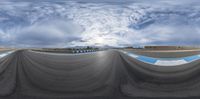 An empty race track at dawn in the USA. The sun is visible, casting a golden glow on the asphalt. The straight road and open space provide the perfect setting for racing enthusiasts. A sunny day for high-speed fun.