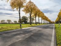 An empty road in Berlin, Germany, surrounded by lush green trees and grass in the foreground. The gloomy grey sky adds a dramatic touch to the European landscape. A perfect autumn day in nature.
