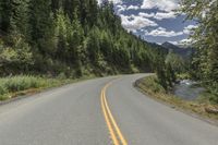 An empty road surface winding through the picturesque landscape of British Columbia. Towering mountains and lush forests frame the straight road, while a river flows underneath. A serene day in the natural environment of Lillooet.