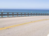 This beautiful stock photo captures an empty road on a California beach by the ocean's edge. The coastal landscape features breathtaking views of the sand, water, and the clear blue sky. The road curves gracefully, leading to a concrete bridge that stretches across the shore. A walkway with a handrail is visible alongside the road, providing access to the stunning beach. The horizon blends with the sea, creating a peaceful and serene atmosphere. The guard rail and Armco barrier ensure safety along the road, while the boardwalk and fence offer a picturesque foreground. This photograph showcases the beauty of nature and the tranquility of the Pacific Coast Highway in Big Sur, USA.