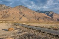 An empty road winds through the rugged California mountains in the desert. Grey sky and gloomy atmosphere create a dramatic backdrop. A lone bench and horse add to the desolate beauty of the landscape.