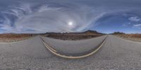 An empty road stretches through the stunning landscape of Canyonlands, Utah. Cloudy skies and distant mountains create a dramatic backdrop. The road disappears into the horizon, surrounded by red rock canyons and vegetation.