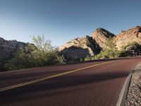 An empty road in the Colorado desert surrounded by magnificent mountains. The clear sky and untouched wilderness make it a perfect day for a road trip through the stunning landscape of Zion National Park.