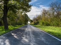 A peaceful rural landscape in Germany. An empty road stretches straight ahead, lined with trees and bushes. The autumn foliage creates a vibrant display, complemented by the lush green fields. The clear sky and sunlight add a touch of serenity to the natural environment.