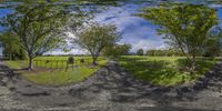 an empty road is surrounded by lush green fields with trees at the end of it
