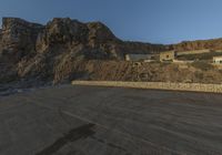 This captivating stock photo captures the beauty of an empty road leading towards a magnificent rock wall. The road, made of smooth asphalt, stretches ahead, creating a sense of open space and adventure. The colossal rock wall, with stairs carved into it, adds to the dramatic landscape. Nature lovers will appreciate the highland terrain and the oceanic coastal view in the background. The picture's backdrop showcases the clear sky at dawn, while the grey concrete surface and bedrock outcrop complement each other harmoniously. This breathtaking scenery is located in Portugal, Europe's enchanting country.