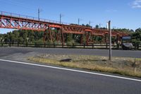 A beautiful landscape in New Zealand showing an empty asphalt road running alongside the Makatote Viaduct. The viaduct is a red-colored structure that adds a pop of color to the serene surroundings. The road stretches out into the distance, giving a sense of freedom and adventure. The clear sky and lush trees create a picturesque backdrop, making this a perfect image for nature lovers and travel enthusiasts. The Makatote Viaduct in Erua is a prominent landmark in the area and adds a touch of architectural interest to this scenic shot.