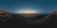 An empty road near the sea in Mallorca, Spain. Moonlight shines on the dark ocean, creating a mystical atmosphere. The straight road leads to a coastal lighthouse, with the Armco barrier visible. A serene night scene in the Balearic Islands.