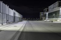 the road is empty at night near a fence and parking lot in front of it