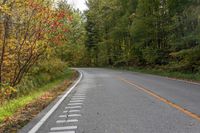 An empty road winds through a forest in Ontario, Canada. Autumn foliage decorates the trees and bushes along the road. The straight path curves and meanders, creating a scenic landscape in Toronto.