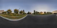 a fish eye lens view of an empty road and parking lot from a perspective point perspective