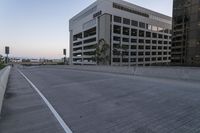an empty road and parking lot on a sunny day at dusk with skyscrapers in the distance