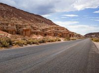the empty road is surrounded by rocky hills and bushes, as well as large rock formations