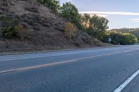 This stock photo features an empty road with a few signs and trees near by on a hillside, illuminated by the setting sun. The asphalt road stretches out into the distance, lined with green grass and woody plants. The rolling landscape creates a picturesque scene with tints and shades, enhanced by the sunlight and clouds in the sky. The hard shadows cast by the trees and hill add depth and contrast to the image. This captivating rural scenery captures the peacefulness and beauty of nature at dusk.