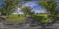 A straight road cuts through the lush green fields of a rural landscape. The clear sky contrasts with the gloomy grey, adding a touch of mystery. Trees line the road, providing shade and creating a serene natural environment.