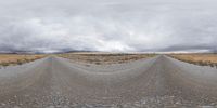 a photo looking at a straight empty road under cloudy skies in the middle of nowhere
