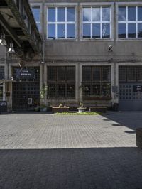 This stock photo features an empty sidewalk with benches in front of the buildings in Berlin, Germany. The architecture of the city is showcased through the concrete and asphalt road surface. The buildings have various facades with windows, adding character to the urban landscape. The walkway is lined with cobblestone, creating a classic European feel. The photo captures a sunny day, with hard shadows adding depth to the picture. The image represents city life and the urban design of Berlin, particularly highlighting the art district known as Hinterhof.