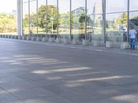 This stock photo shows an empty sidewalk outside of a modern city building on a sunny day. The city is Berlin, Germany. The building showcases modern architecture with a glass wall. The road surface is made of asphalt, with parked vehicles and automobile tires visible. The building is located in a residential area, surrounded by trees and vegetation. The clear sky creates a beautiful backdrop for this urban scene. This photo represents the bustling business district in Berlin and highlights the city's infrastructure and urban design.