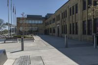 This stock photo features an empty street in a neighborhood in Toronto, Canada. The scene showcases a clear sky and modern architecture as the backdrop. There are benches situated on the curb, providing a spot for pedestrians to rest and enjoy the urban surroundings. The road surface is made of smooth asphalt, and the buildings in the area are predominantly brick and stone, adding to the charm of this art district. The image captures the essence of urban design and the bustling business district of Toronto.