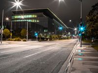 This stock photo captures a gloomy night scene in Long Beach, California. The street is empty, and a bright street light illuminates the road surface. The tall office building in the background adds to the urban atmosphere. The black asphalt road and the grey sky create a dark and low ambiance. The modern architecture and urban design of the city are reflected in the scene. This image can be used to depict city life, urban infrastructure, and the artificial light in a business district.