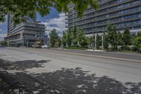 A modern architectural marvel in the heart of Toronto, Ontario, Canada. This stock photo showcases an empty street with a tree in the middle and some tall buildings in the background. The asphalt road surface reflects the open space and clear blue sky above. The city's urban design is exemplified by the high-rise condominiums and skyscrapers that line the thoroughfare. The tree and vegetation provide a natural touch to the urban landscape, creating a harmonious blend of nature and city life. The sunlight casts hard shadows, accentuating the striking architecture of the buildings.