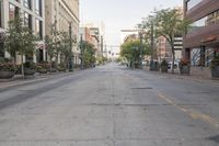 A photo of an empty, deserted street in Denver, Colorado. The street is surrounded by buildings and cars on either side. The architecture is classic and the road surface is made of concrete. This residential area showcases urban design and city life in Denver, with its straight road leading through the neighborhood. The image captures the urban infrastructure and public space of this vibrant cityscape in the USA.