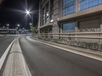 An empty city street at night, with streets lights illuminating the road surface. The tall buildings and windows give a metropolitan vibe. The asphalt thoroughfare is void of any traffic.