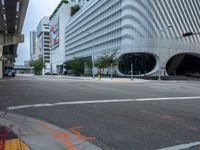 Empty street in a futuristic urban cityscape. Modern office buildings line the road, illuminated by the soft morning light. A bridge and a bus stoplight add to the city's bustling energy.