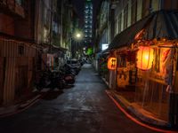 a night shot showing a street that is empty with motorcycle parked in it and a building in the background