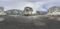 this view shows an empty street with buildings on either side and a stop sign in the middle