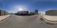 A panoramic view of a suburban street in Los Angeles, California. The empty road leads to a vibrant red building, contrasting with the clear sky. Classic architecture and modern design elements blend in this cityscape.
