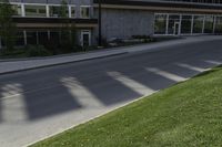 a road with an empty street sign on the sidewalk in front of a building with multiple windows