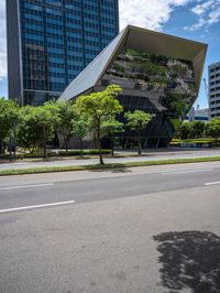 An empty street in Taipei City, Taiwan, showcases modern and futuristic architecture. The clear sky reflects on the water puddle, highlighting the vibrant urban design. The city's vegetation adds a touch of green to the urban landscape.